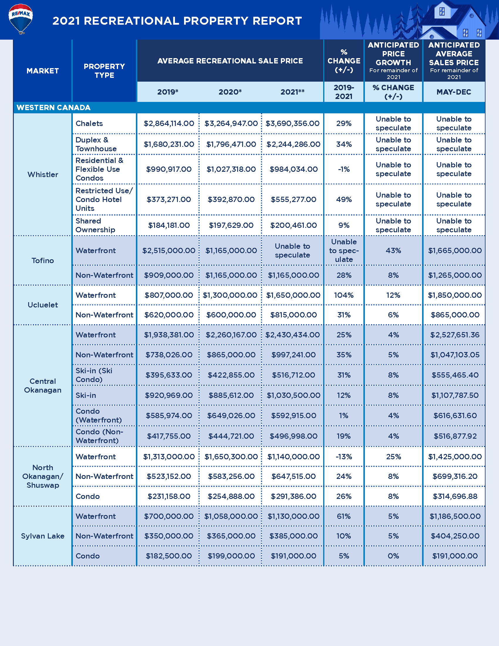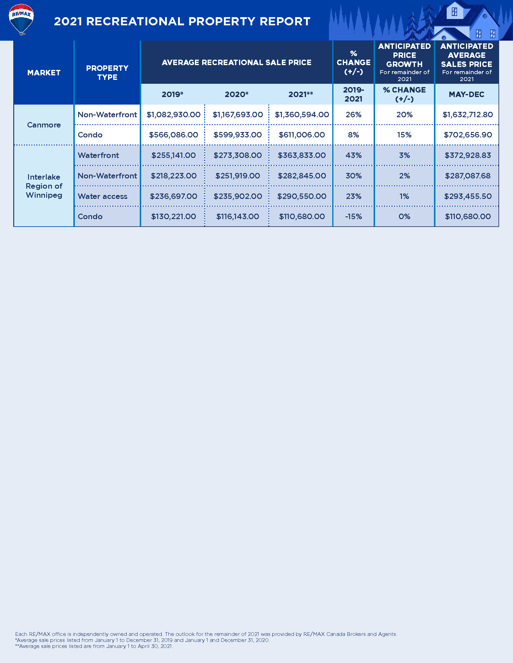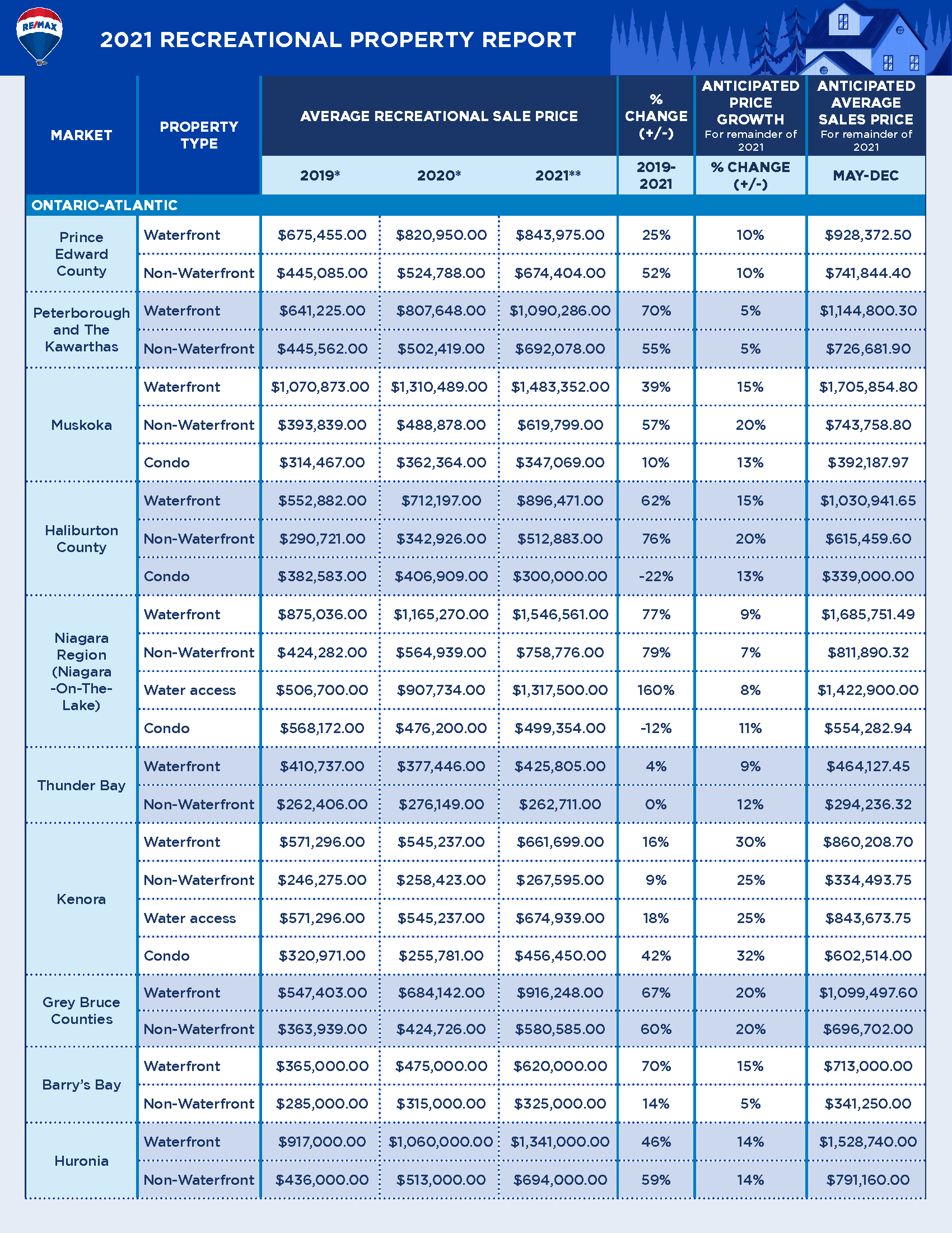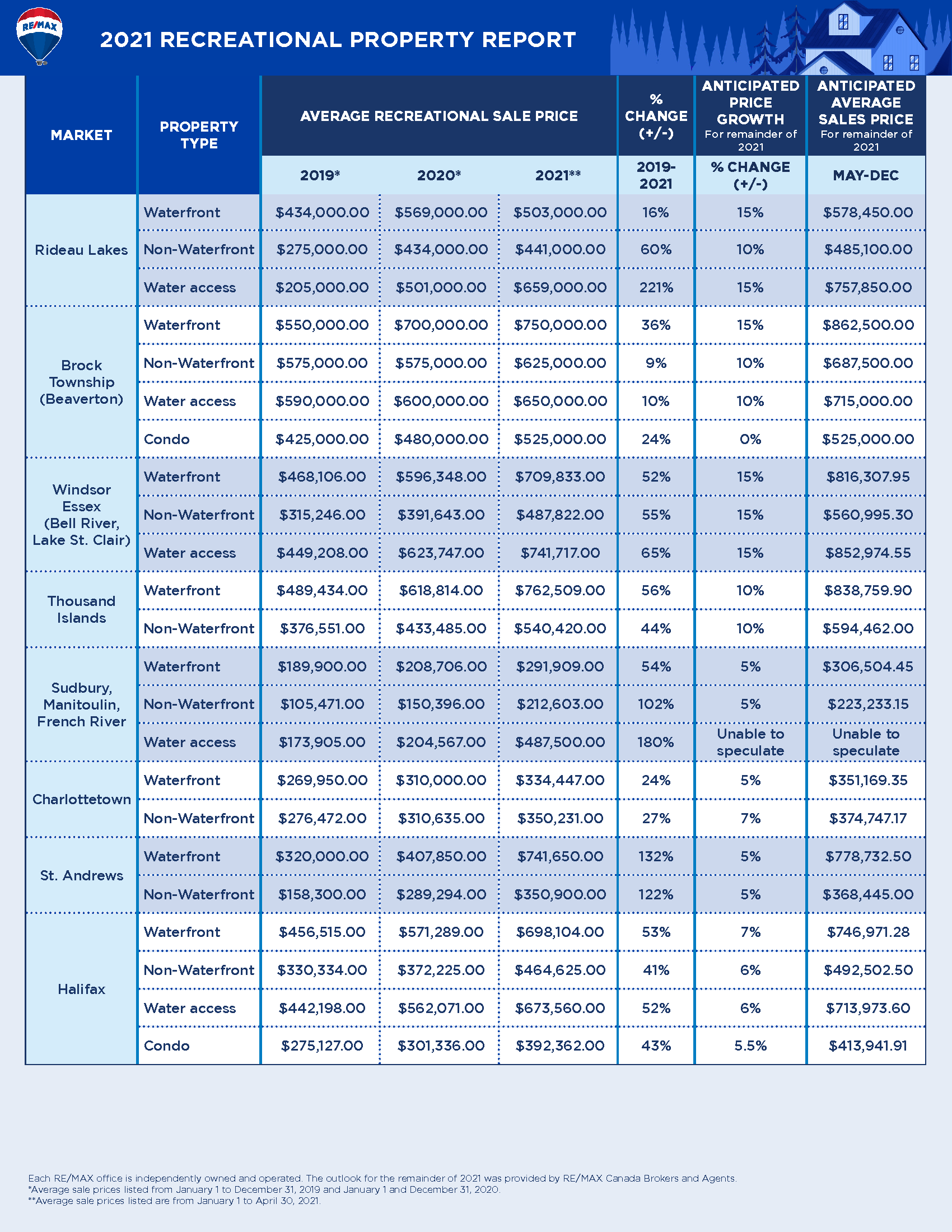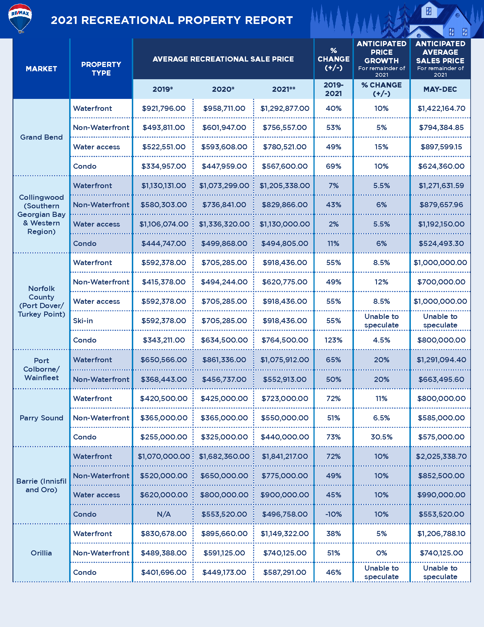 - Average sale price anticipated to rise up to 30% in some recreational property markets, according to RE/MAX brokers and agents.
